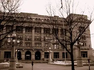 The Douglas County Courthouse is located at 1701 Farnam Street in Omaha, Nebraska, United States. Built in 1912, it was added to the National Register of Historic Places in 1979. Notable events at the courthouse include two lynchings and the city's first sit-in during the Civil Rights Movement. Five years after it was opened, the building was almost destroyed by mob violence in the Omaha Race Riot of 1919.