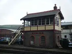 Built in 1892 and located at the station throat between the carriage shed and the workshops. The Points Box, as it was called locally, contained a 36-lever frame signal box was built by Dutton & Co., of Worcester, and supplied to the railway when the yard was further modified and the workshops were extended. The frame is a unique survivor of the 'drink-handle' type in which the handle of the lever also serves as the catch handle. The 'box features a set of characteristic wooden external steps that must be climbed to access the levers, with storage space beneath the timber-built top section, this would have housed all the linkage and control gear.