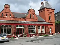 The smaller building that now houses the public and passenger toilet facilities and storage areas was once also used as the railway's own stabling facilities and incorporated porters' accommodation. In more recent times the stables have become garages which are leased out, there being three in total. The fourth old stable has been converted into accommodation and was once used by the night watchman and as storage space. The old porters' rooms were converted into the railway's souvenir shop in 1993 as part of the Year Of Railways and remained as such until the 1999 season when the premises closed and the space was let to the tenants of the station restaurant for storage purposes. When open the shop stocked a range of railway and transport-related publications, videos and magazines as well as a large range of postcards and souvenirs, which are now located at the Isle of Man Railway Museum in Port Erin. What now forms the ladies and gentlemen's' toilets next door was once entirely devoted to the gentlemans' facilities whilst the ladies waiting room was within the administrative structure. This setup was amended when rationalisation of the whole site was carried out in 1979 resulting in the facilities provided today. The toilets are also utilised by customers of the station restaurant and when closed are gated across. At the entrance to the platform there is a shall wooden chalet structure which is used by station staff when checking tickets, it also houses various signage and cleaning equipment. This structure was installed in 1991 replacing an earlier version which was time-expired; this structure was originally in a varnished finish but as part of minor refurbishments in 2009 was painted into the standard maroon and cream livery.