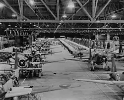 Vultee Aircraft was Downey's largest employer during World War II producing 15% of all of America's military aircraft by 1941.[16] The company was a pioneer in the use of women in manufacturing positions and was the first aircraft company to build airplanes on a powered assembly line.[14] Vultee became a part of North American Aviation (later North American Rockwell, then Rockwell International which was then bought by the Boeing company) whose facilities were the birthplace of the systems for the Apollo Space Program as well as the Space Shuttle. For over 70 years, Downey's Rockwell NASA plant produced and tested many of the 20th century's greatest aviation, missile, and space endeavors.