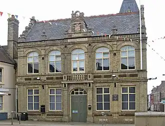 The new building was designed by John Johnson in the Renaissance Revival style, built by Bennett Brothers in yellow brick and brown carrstone at a cost of £1,730 and was officially opened by the member of parliament, William Tyssen-Amherst, on 20 October 1887.[6][7][8] The design involved a symmetrical main frontage with five bays facing onto the Market Square; the central bay featured a doorway with a fanlight flanked by square Doric order columns supporting a cornice and a balustraded balcony. On the first floor, there was a central round-headed French door, while the other bays were fenestrated by square-headed windows on the ground floor and round-headed windows on the first floor. At roof level, there was a balustrade, a panel inscribed with the words "Town Hall" and a central gable containing a shield and a stone inscribed with the date of construction. On the north side of the building there was a short tower with a mansard roof and a weather vane.[1] Internally, the principal rooms were an assembly hall, a corn exchange, a library and a reading room.[9] The local literary institute, which had been established in 1865 following a gift by Edward Stanley, 15th Earl of Derby, occupied the library and reading room following completion of the town hall.[9]
