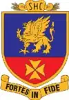 The Downlands College Badge consists of a horizontally-divided field in the College colours, royal blue and cardinal red. The upper of the shield carries a gold gryphon, and the lower half bears the Maltese Cross of the State of Queensland. The shield is surmounted by the heart crest with the letters SHC (Sacred Heart College) supported by a ram's horns and ears of wheat, to symbolise the college's setting in the Darling Downs. The college motto, Fortes in Fide, meaning Strong in Faith[1] is emblazoned under the crest.