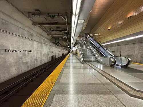 Originally slated to be called Sheppard West,[13] the station was referred to by that name throughout its construction.[14] However, in 2010, approval was granted for the station to be named Downsview Park, contingent upon successful negotiations between the Toronto Transit Commission, the City of Toronto, and Downsview Park regarding property acquisition. As part of this agreement, the existing Downsview station was renamed Sheppard West. Other names considered for this station were GO/Sheppard, Chesswood, Bakersfield, and Carl Hall.[15]