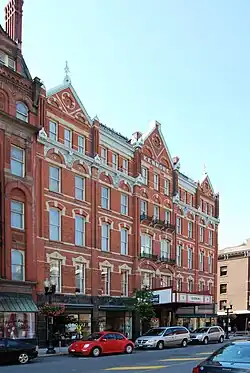 In the years after the Civil War commercial interests started building taller and more massive edifices along North Pearl and State streets. Albany native Edward Ogden designed the 1873 Kenmore Hotel on North Pearl, and expanded it in 1891 with Queen Anne touches. His 1889 Albany Business College building opposite the Kenmore likewise uses the Richardsonian Romanesque style. Another local architect, Albert Puller, had given downtown the YMCA building at 60 North Pearl, in that style three years earlier.[2]