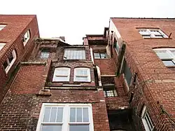 The building's rear section rises to four stories, but the southwestern one-third of this section rises to three stories topped by a terrace (currently covered with protective fiberglass). Part of the rear section's northeast wall is recessed, as Stone attempted to build around a Maple tree growing on the lot. The walls of this section were set irregularly to accommodate the tree's branches.[2]
