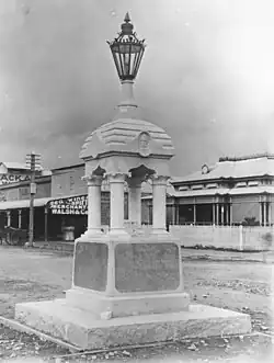 To honour the memory of their esteemed physician, a public subscription was raised in Cairns to fund a memorial which would be not only aesthetically pleasing, but functional, and Messrs Melrose and Fenwick of Townsville were commissioned to design a memorial in the form of a drinking fountain. As it was to be located in the centre of the intersection of Abbott and Spence Streets in the heart of the town, a gas lamp was placed on its top.[1]
