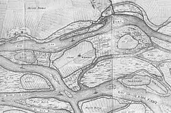 The islands of Dradenau were sold to Hamburg in 1445 by Count Otto von Holstein.[2] By 1840, it was leased as private property with two farms and 66 inhabitants.[3] As part of the Hamburg port extensions, the Köhlfleet, another channel north of Dradenau channel, was reclaimed, which connected the islands to Waltershof, an area of Hamburg. By the late 19th century, the channel disappeared entirely due to silting and the construction of the port of Hamburg.[3] A sewage treatment plant, Klärwerk Dradenau, currently exists where it used to flow.[4]