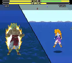 Super Butōden 2 uses a customizable six-button control scheme.[4] Special moves are present in conventional format, with most commands consisting of button combinations.[4] Characters can also dash back and forth by pressing L and R respectively.[4] Players can also charge their Ki gauge by holding the Y and B buttons to unleash a Ki blast attack.[4] Returning from the first game is the split-screen feature;[6] the view is split to keep fighters that are far away in the playfield shown in a single screen, while their positions are kept via an improved on-screen radar.[6] New to the sequel are the introduction of water-based arenas, the ability to counterattack special moves, as well as meteor combos to perform consecutive attacks for most characters (only Goku had one such move in the previous game).[5][7][8]