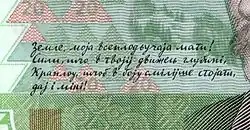 An example of the use of Drahomanivka was presented on the 2003 Ukrainian twenty-hryvnia banknote. It shows a fragment of Ivan Franko's poem "Veselka", written in the Drahomanivka, beside the poet's portrait: