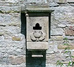 The walled garden survives, but without the previous ornate garden and central pond that once lay within. A marriage stone with the date '1786' and the initials 'JK' paired with 'WM' has been incorporated into the inside of one wall of the walled garden, presumably originating from an early dwelling house belonging to the Knox family, such as 'Redheugh' in Kilbirnie, childhood home of William Barr Knox. 'wBk 1924' (William Barr Knox) is carved on a panel above the keystone above the entrance that faces the house. 'DB KK 1931' is carved on a probable fountain spout near the shelter on the western end of the walled garden. A pair of finely carved ornate stone features project from the arches that front the old shelter or summer house. The remains of another summerhouse overlooks the site of the old tennis court as shown on OS maps.