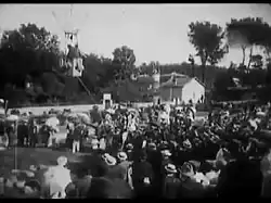 The programme for the Première of the film in Verdun on 27 August 1904 indicated as follows the titles of the 8 scenes: 1. Ballasting the Balloon. 2. The Departure. 3. In the air. 4. What is seen from the basket. 5. Terrible storm. 6. Lightning ignites the gas in the balloon. 7. Terrible fall of the aeronauts on the open sea. 8. The rescue.[5]