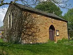 The church of St James stands on the green in Drayton and was listed as being Grade II on 7 December 1966.[5] It is a single room built of stone and roofed with slate, constructed on the site of the former chapel which fell out of religious use in the 18th century and had been converted into a bake-house by 1794. In 1878, George Lewis Watson of Rockingham Castle bought the building and proceeded to remodel it throughout 1878-79 into a mission church.[6] The door is in the centre of the south side; the east end has one, and the west end two, lancet windows. A bell on a bracket projects from the east end. A large semi-circular arch internally suggests that it was of 12th century origin. It is said to be Leicestershire's smallest consecrated church.[7]