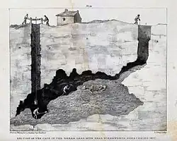 Dream Cave was discovered by lead miners in December 1822, during work to sink a new shaft 60 feet (18 m) down into a hillside above Wirksworth to reach productive veins of lead ore within Dream Mine. In doing so, the miners unexpectedly penetrated a large natural cavern within the hillside which had become completely infilled with a loose material of argillaceous earth and rock fragments. According to a detailed contemporary account, as they excavated this material to continue their downward progress, the loose infill began to shift and collapse around them. The act of removing this loose material eventually exposed the roof of the cave itself. Close to the centre of the collapsing mass, the miners found numerous bones and what was probably at the time a complete skeleton of a large mammal before the collapsing sediments caused the bones to separate.[4] In removing the infill, the miners had uncovered what, on expert examination, turned out to be the nearly complete skeleton of a rhinoceros.[2][5] This was subsequently confirmed to be a woolly rhinoceros (Coelodonta antiquitatis).[6]