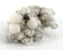 It is a member of the carbonates family,[4] mostly consisting of oxygen (44.29%), barium (34.56%) and aluminum (13.58%), but otherwise contains carbon (6.05%) and hydrogen (1.52%).[5] It is associated with weloganite, dawsonite, quartz, and plagioclase.[6] It grows into tapering acicular crystals, elongated along [001] and bladed on {010}. It is typically in divergent spherical and hemispherical aggregates. It occurs in cavities in alkalic sill in limestone.[7] Size is up to 5 mm. It is soluble in dilute hydrogen chloride, and dissolves readily with a effervescence.[8] It is the barium analogue of dundasite.[9] Dresserite does not show any kind of luminescence whatsoever.[4] The measured density of the mineral, due to its fibrous nature, is too low. The differential thermal analysis (DTA) curve of the mineral is similar to dundasite's in appearance. The principal endothermic peak is at 384°C. When heated up to this degree, dresserite loses all of its water and carbon dioxide.[10]