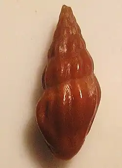 (Original description in Latin) The shell is elongated-spindle-shaped and very solid. It is shiny, and bright reddish or chestnut-colored. Sometimes it is adorned with a lighter, rather indistinct spiral band following an incision below the suture. The spire is exactly turreted, and the apex is very sharp.