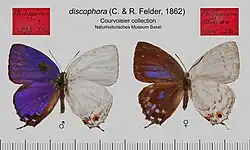 Drina discophora is a butterfly in the family Lycaenidae. It was described by Cajetan Felder and Rudolf Felder in 1862. It is endemic to the Philippines (Mindoro).[2]