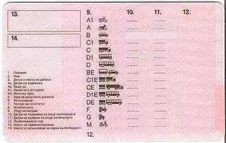 In North Macedonia, the driving licence (Macedonian: возачка дозвола, Albanian: patentë shoferi) is a governmental right given to those who request a licence for any of the categories they desire. It is required for every type of motorised vehicle. The minimum age to obtain a driving licence is 16 years.[1] Regardless of age, in the first two years after obtaining the licence the driver is called a beginner (Macedonian: почетник), and has limited rights concerning driving speed and when they can drive without a co-driver in the front seat who does not have a drivers licence (until 23:00).