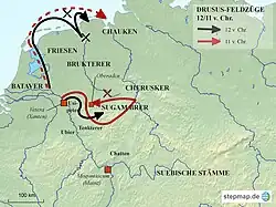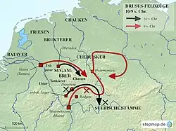 After winning the elections for consul in 9 BC,[88] Drusus led three legions with auxiliary troops from Mainz, first against the Chatti and then against the Suebi. Cassius Dio reports considerable efforts and Roman losses.[89] At the same time, a legate, probably with two legions, invaded the Sugambri region from Xanten. This operation is not recorded, but can be made plausible from the course of the war.[90] The simultaneous operations isolated the enemy forces and increased the devastation. Furthermore, the legate secured Drusus's wide-ranging operations.[90]