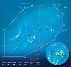 The park area is more than 99 percent water. The northern and western portions of the park, including the central island group, were designated a 46-square-mile (120 km2) research natural area in 2007, in which no marine life may be taken, nor may vessels anchor. Vessels wishing to moor in this area must use designated mooring buoys or docks. About 54 percent of the park remains open for fishing.[9] The park is bordered on the east, south and west by the Florida Keys National Marine Sanctuary, and on the northwest by the Tortugas Ecological Reserve.[10]