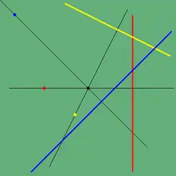Three pairs of dual points and lines: one red pair, one yellow pair, and one blue pair.