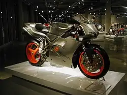 - ^ "Other features introduced on the 916 included a single-sided swing arm, patented adjustable steering, an exhaust system with twin mufflers exiting just underneath the seat, and one of the most distinctive styling jobs ever seen on two wheels."—The Art of the Motorcycle[8]