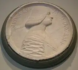 Ludovico il Moro never went to his own duchy, which was administered by governors: in 1482 it was governed by Benedetto Castiglioni,[20] two years later by his sister Ippolita, wife of Alfonso II. The names of governors Giovanni Ermenziano and Paduano Macedonio are also mentioned.[21] Beginning in 1480 the duchess of Bari was also named Beatrice d'Este, niece and adopted daughter of the king, by the will of her ancestor Ferrante, who gave her in marriage to Ludovico.[22]