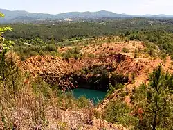 Copper from the basin was extensively mined between 1847 and 1987.[2] In 1899, the Tennessee Copper Company, which had bought most of the mining operations in the Copper Basin, constructed a smelter at Copperhill and began work on the Burra Burra Mine at Ducktown. The company's open roast smelting method released large amounts of sulfur dioxide into the air, killing off all vegetation in the central basin.[3] The Burra Burra Mine eventually became the most productive mine in the Copper Basin.[4] Mining activities began to decline in the mid-1950s, and by the time the Burra Burra Mine closed in 1958, its vertical shaft was over 2,400 feet (730 m) deep, making it one of the deepest vertical shafts in the North America.[5] After the mine's closure, operations continued at other deposits within the Basin.