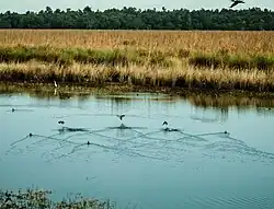 Dudhwa National Park is habitat of over 400 species of birds, including both resident and migratory. It includes Indian peafowl, ducks, geese, hornbills, heron, hawk, bee-eaters, minivets, kingfishers, painted storks, sarus cranes, swamp francolin, woodpeckers, barbets, minivets, bee-eaters, bulbuls, Bengal florican, Asian barbets, drongos, barbets, cormorants, teal, egrets, orioles, painted stork, fishing eagle, owls.[5] The white-rumped vulture and red-headed vulture, both Critically Endangered vulture species have been sighted in the park.[10][11]