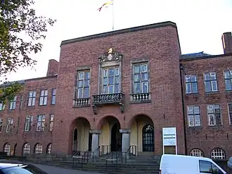 The first part of new complex was the assembly hall in St James's Road which became known as Dudley Town Hall. It was built with financial support from a legacy left by the former local member of parliament, Brooke Robinson, and his wife, Eugenia, and included several courtrooms, a museum and a memorial tower.[5] The memorial tower was intended to commemorate the lives of local service personnel who had died in the First World War.[6] This part of the complex was designed by Harvey and Wicks in the Neo-Georgian style, built with red brick and stone dressings and was officially opened by the Prime Minister, Stanley Baldwin, on 20 October 1928.[7] The design involved a near-symmetrical main frontage with five bays facing onto St James's Road; the central section of three bays, which slightly projected forward, featured three arches with wrought iron gates on the ground floor and a balcony and a stained glass mullion window with the town's coat of arms in the tympanum in the central bay on the first floor.[7] There were also stained glass mullion windows in the other bays on the first floor.[7] The design is thought by English Heritage to be based on the Doge's Palace in Venice.[7]