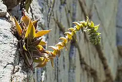 Dudleya cymosa subsp. crebrifolia is a subspecies of succulent plant commonly known as the San Gabriel River dudleya. Endemic to Los Angeles County, California, this very distinct subspecies is only known from the granitic slopes of a few canyons at the foot of the San Gabriel Mountains near Azusa. It is characterized by the tightly spaced bracts along its inflorescence and its mustard-yellow flowers that bloom from late June to July. It grows with another rare endemic, Dudleya densiflora.[2]