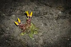 Dudleya cymosa subsp. marcescens is a species of summer-deciduous succulent plant known commonly as the marcescent dudleya or marcescent liveforever. Throughout the months of spring, it is characterized by a bloom of small, bright-yellow flowers with 5 petals, tinged with orange or red. It is a leaf succulent with a basal rosette, with the foliage withering in summer, going completely leafless, a neotenous trait in the genus.[2] This species is endemic to the exposed volcanic rock of the Santa Monica Mountains in California, being found on shady slopes and outcroppings.[3] It differs from its local congeners with its deciduous habit, slender caudex, and narrower leaf shape, although it is superseded in some of these characteristics by Dudleya parva, growing 13 km to the north, which has even narrower leaves and is quicker to lose them.[4] Because of its restricted distribution and small size, it is vulnerable to habitat degradation and disturbance from acts of graffiti and rock climbers.[5] It is listed as threatened by the United States Fish and Wildlife Service.[6]