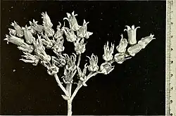 The peduncle is 2–25 cm (0.79–9.84 in) tall, and 1–4 mm (0.039–0.157 in) wide. The peduncle is covered in 15 to 25 spreading bracts, which are shaped cordate-ovate, and are 8–13 mm (0.31–0.51 in) by 5–7 mm (0.20–0.28 in) wide. The inflorescence is an ascending cyme, which is simple or 1 to 2 branched. The branches may subsequently be simply or 1 times bifurcate, and give way to the cincinni, or terminal branches. The terminal branches are circinate, unfurling like a fern's frond, and have 3 to 9 flowers on them. The flowers are suspended on pedicels 5–8 mm (0.20–0.31 in) long.[3][4]