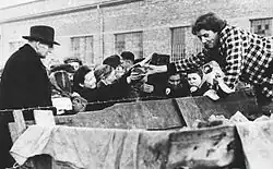 The Main Welfare Council and the Red Cross were not the only Polish organizations organizing aid for the refugees from Warsaw. Fundraising and donations were organized by the Railway Social Care under the direction of Stanisław Pieścik and Józef Zieliński, the Volunteer Fire Brigade, local consumer cooperatives, as well as Catholic parishes and orders with their Caritas branches.[101][102] Assistance to the refugees was spontaneously provided by the inhabitants of Pruszków and nearby towns.[103] In response to the appeal announced in churches, the city's residents began to bring ready-made meals, mess kits, bowls and cutlery, kitchen utensils, and blankets to the camp. Farmers shared their harvests.[35][104] Many volunteers from Pruszków approached Father Tyszka, declaring their willingness to work in the camp.[30]