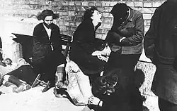 The refugees brought to the camp had to jump off the wagons amidst shouts and pushes, as there were no platforms at the Pruszków siding. Then, amidst a corridor of Germans, they were driven into one of the nine production halls. Guards were unallowed to assist the sick, injured, or elderly when disembarking from the wagons or carrying loads. Only Polish personnel recruited by the Central Welfare Council could do this, but their numbers were too few considering the size of the transports.[74] The halls where the refugees were placed were surrounded by barbed wire and supervised by German posts.[75] Leaving the halls was prohibited, so only Polish personnel could move relatively freely within the camp.[76] There were incidents where people standing too close to the fence were harassed by dogs. German agents and military patrols searched the crowd of refugees for hidden Home Army soldiers.[77]