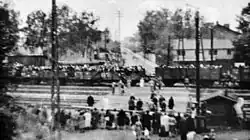 In the early days of Dulag 121's existence, the refugees were moved on foot to Pruszków. In the following weeks, they were brought by train, usually from Warszawa Zachodnia station.[53] Varsovians were brought to Pruszków by both the Skiernewice Railway trains and EKD trains. The latter stopped in Pruszków, from where their passengers (usually brought from the Zieleniak market in Ochota) were driven to the camp through the city by foot along a three-kilometer route. The Skiernewice Railway trains, on the other hand, were unloaded on the premises of Dulag 121 – near gate no. 14.[54] By the end of August and in September 1944, several dozen passenger (from 3 to 6 carriages) and freight trains arrived at the camp daily.[51] Typically, there were between 5,000 and 40,000 refugees in Pruszków at one time.[a][55] A massive influx occurred after the fall of the Old Town, when around 75,000 refugees ended up in Dulag 121.[56] However, the largest number of refugees arrived at the camp after the capitulation of the Warsaw Uprising. During this time, nearly 150,000 people passed through Dulag 121.[57]