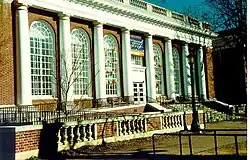 In the fall of 1923, Malone assumed a position as an associate professor of history at the University of Virginia;[33] his office was located at the top floor of the Alderman Library (now Shannon Library), where it would remain for some decades.[32] The university had been relatively small at the time, and the whole of the history faculty consisted of just Malone and Richard Heath Dabney, the father of Virginius Dabney, upon his arrival.[32] Dabney had been encumbered with the entirety of the history curriculum which spanned from ancient to modern. Malone undertook the courses in European and American history, giving up the courses in European history upon the arrival of Stringfellow Barr and thereafter introduced new courses in colonial history and more contemporary American history.[28]