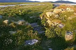Dun Vulan is an Iron Age (c. 150–50 BC) broch located on the southern edge of the promontory; it is now protected as a sea wall.[1] Excavations revealed an oval-shaped broch with a maximum diameter of 19.5 metres, with walls surviving to 4.5 metres in height and 4 metres in width.