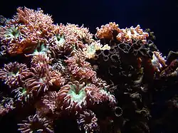 D. axifuga is a species of coral often encountered in the aquarium trade where it is commonly called the duncan coral and referred to as a type of large-polyp stony coral (LPS).[5] It has become increasingly popular due to the relatively easy care requirements for the growth of the coral and the fast rate at which it grows. The duncan coral generally prefers to inhabit an established reef aquarium if brought into captivity. They live in saltwater, so an artificial saltwater mix should be provided for them to live in, and they require a temperature preferably between 75 and 80 °F (24 and 27 °C). These corals, like many other LPS corals, need low to moderate lighting to photosynthesize. Duncan corals also require a low to moderate current to bring them food such as phytoplankton or zooplankton naturally. However, target feeding can be supplemented by using a tool to dispense food onto the polyp's tentacles. This coral should be placed low in the tank, preferably on the substrate or on a low-lying rock, where the coral can form a colony. Propagating this coral is achieved by separating polyps from the base of the coral.[5]