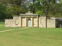 The ha-ha wall in the grounds of the house is built of sandstone, and consists of four to five rusticated courses with capstones. It curves, and runs from the northern stable block to the Ionic temple.[17] It is unusual as an example of a retaining wall with decorative stonework.[22] Its date of construction is unconfirmed; some sources describe it as "England's first ha-ha".[23]