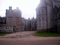 The barony of Echt had been owned by the Forbes family since 1469 and the original mansion house, built in 1705, was known as Housedale. The present mansion is located slightly to the south-west of it.[3][4] In 1820 William Forbes commissioned the Aberdeen City Architect John Smith to design a replacement house in a basic two-storey Grecian-inspired style. The house and lands were sold to the 24th Earl of Crawford in 1845[5] for £117,000.[6] His main family residence was Haigh Hall in Lancashire and it was under the instruction of the 25th Earl of Crawford, his eldest son who succeeded him in 1869, that further extensive additions were made to the Dunecht mansion.[5][7] This phase of architectural work was undertaken by Smith's son William and spanned from 1855 to 1859.[8]