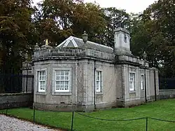 The Tower lodges and gates at Loch of Skene are also category A listed.[20] Several other structures within the estate are designated category B including the lodges.[21] The formal gardens are sited to the west and south of the mansion and feature two large terraces designed by Aston Webb in the early 20th-century.[8]