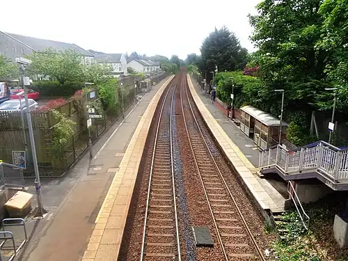Since 13 December 2009 the station has had a mainly half-hourly service each way to Glasgow and Kilmarnock respectively, with some southbound trains continuing to either Carlisle, Girvan and Stranraer.[4]