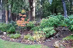 The Botanical Gardens encompass about ten acres (4.0 hectares) of a hilly, wooded area with a meadow, a playground area, and picnic sites bordering the Upper Sacramento River. Native white dogwood is prolific in the park and blooms in the spring. There are many Shasta lilies growing on the hillsides and native azaleas grow along the river. In addition to the many native species, a variety of other perennial plants and shrubs have been introduced. These include rhododendrons, hostas, ferns and Japanese maples. During the spring and summer, various annual plants are cultivated.[2]