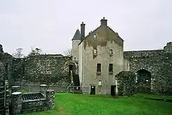 A second range stood along the north-west wall, and would have been connected to the hall range by the donjon tower. The ground floor housed a kitchen. In 1725 the range was remodelled into a two-storey house, accessed via a stone stair, and topped with the dormer windows which now form part of the gatehouse. The well in front is original, although the large stone surround is of 19th-century date.[25]