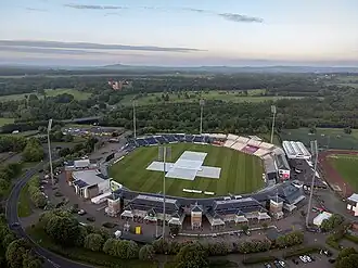 The club's acceptance into first-class cricket was made conditional on the building of a new Test match-standard cricket ground.[18][19][20] Work began on the new ground at the Riverside, a spectacular location overlooked by Lumley Castle, in 1990, and the ground hosted its first game, Durham v Warwickshire, on 18 May 1995.