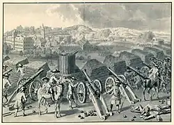 The Dutch government now had to make an attempt to imitate this logistical reform to be able to equal the French numbers in the field. Unlike the French, they based their system on the economic might of early-modern capitalism in the Netherlands, however. Instead of entrusting the supply of bread to government bureaucrats it was contracted out to the firm of Antonio Alvares Machado and Jacob Pereira, two Portuguese-Jewish businessmen, living in Amsterdam; these two were the leading providiteurs general, as William had them called,[56] and the firm organised the entire process of the supply of bread to the Dutch field army from the buying of grain to the timely delivery of bread to the camps at a level sufficient to sustain the large numbers of the Dutch field armies in the subsequent wars with France through the War of Spanish Succession. This logistical support enabled William III to make his daring sortie to capture the strategic fortress of Bonn in 1673, which forced the French to evacuate the occupied Dutch provinces, because their supply lines were cut. In later years the States Army followed the French reforms in other respects also, developing its own array of supply bases in the Spanish Netherlands. This enabled the Dutch not only to match the size of the French field armies, but also to extend their own campaign season in the early Spring.[57]