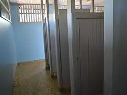 Girls interwar concrete toilet block interior showing early partitions and openings with timber batten screens, 2018