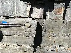 The Dwyka Group is mainly known for petrified wood which increase in species diversity in the younger sequences.[24][25] The cold, glacial environment that the sedimentary rocks of the Dwyka Group were deposited in was not conducive for high plant diversity. Fossil wood species identified include lycopods, especially from the Karasburg, Kalahari, and Huab Basins in Namibia. Glossopteris leaf impressions, the petrified remains of Dadoxylon, coprolites, fossil pollen, and trace fossils of bony fishes, crustaceans, and other arthropods have been found from the Dwyka Group and correlated geological formations from other basins.[26][27][28][29][30]