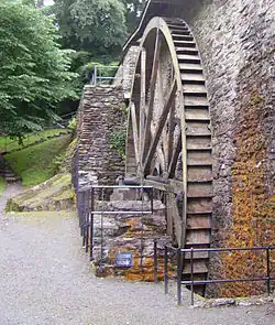 The furnace built around 1755 was only used for about fifty years to smelt iron ore. By 1810 it had been abandoned and the waterwheel removed.[1] The etching by John George Wood to accompany his "The Principal Rivers of Wales", published 1813, shows the furnace in its transitional form with no waterwheel attached. Some time later a new waterwheel was installed – the one that has been renovated and is visible today – and the furnace became a sawmill. The furnace site was renovated around 1988.[2]