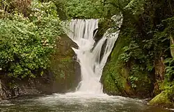 Waterfall on the River Einion at Dyfi Furnace. A mill race leads from the top of the waterfall to power the breastshot waterwheel
